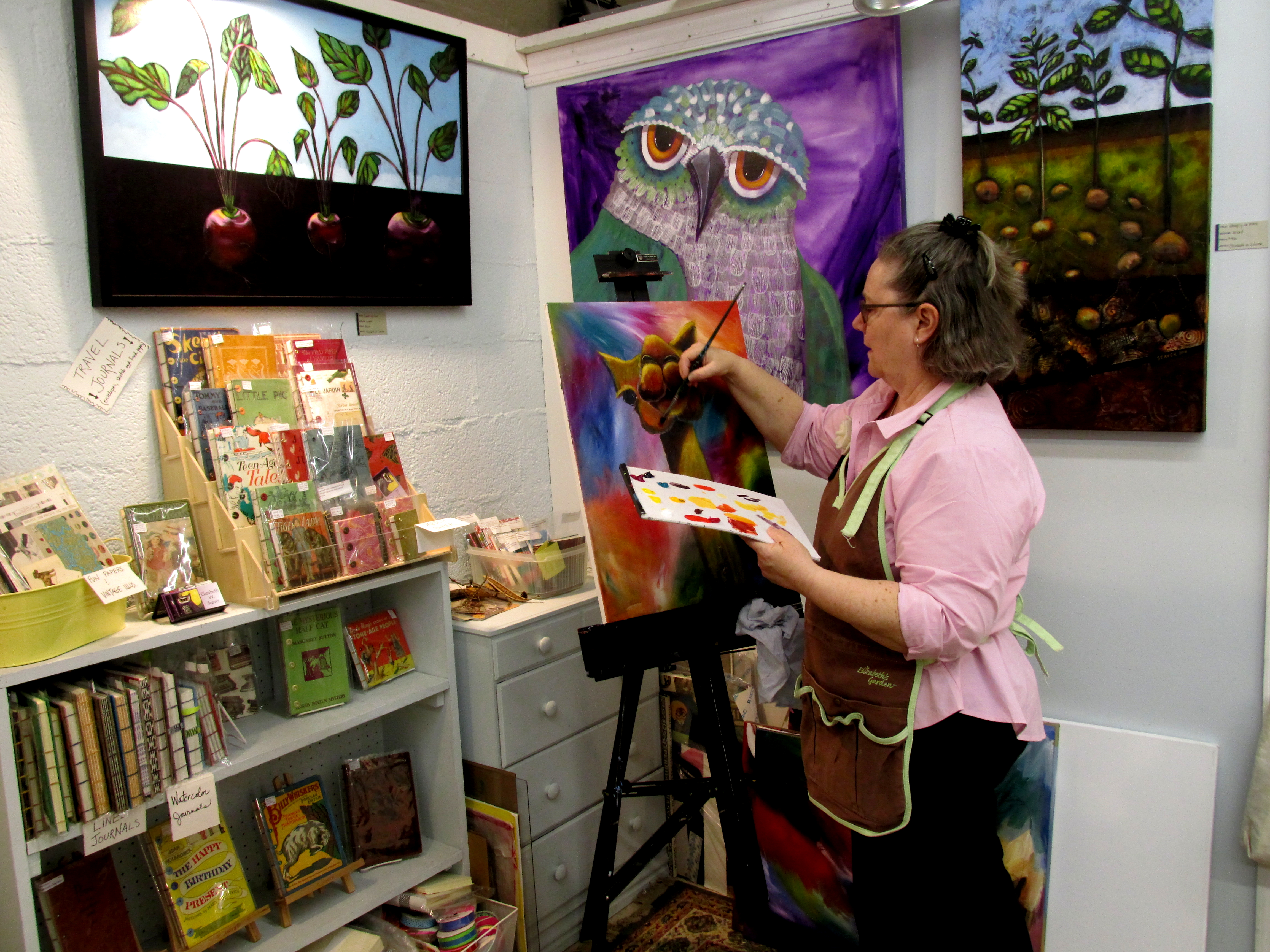 I paint whimsical animals on canvas, linen, and wood with bold acrylic paint, adding papers and printed designs to add texture, which I very much like. In my two-dimensional world, all the creatures happily coexist, but otherwise can exhibit very human sour moods, vanity, recklessness and sloth, and any number of other habits. My subjects are braver than I am. They dare to do what I only wish I could, if I cared a little less for what people might think. One day, I hope to grow up enough to become one of my paintings. Meantime, when I am not teaching, making books/journals, printmaking or fashioning jewelry, I keep my brush wet and my apron messy.